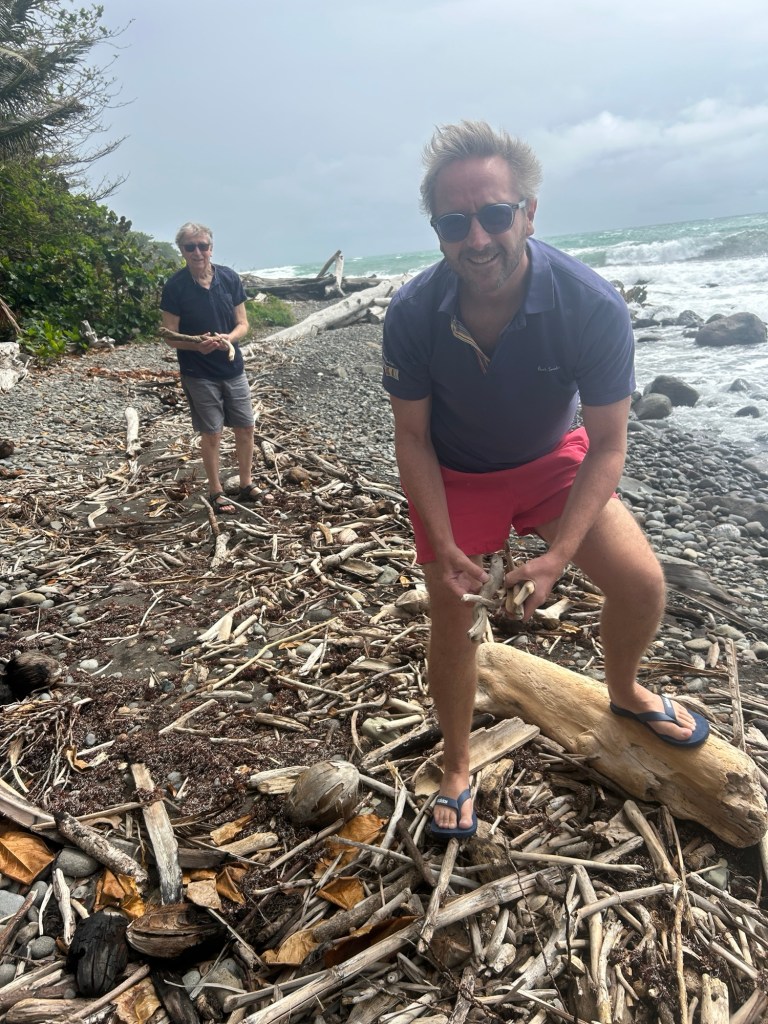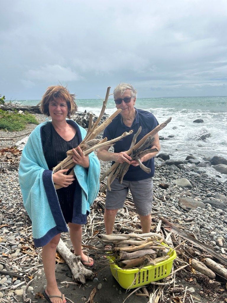 En ce dimanche 2 mars, une opĂ©ration commando est organisĂ©e avec papi et nanny, les parents d’Olivier, qui sont venus nous rendre visite pendant quelques semaines. Il sont bretons (de Nantes, n’entrons pas dans le dĂ©bat…), et n’ont donc pas Ă©tĂ© dĂ©paysĂ©s par la virĂ©e du jour. En effet, nous sommes allĂ©s Ă Capesterre, sur une plage « secrĂšte » jonchĂ©e de bois flottĂ©, trĂ©sor, dont nous avions besoin pour la dĂ©coration du gite Feng Shui. Le bois flottĂ© Ă©tait bien au rendez-vous, mais aussi un vent qui a fait voler la mĂšche lĂ©gendaire de papi!